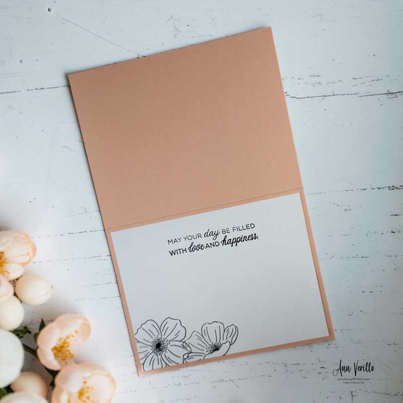For the inside I stamped the sentiment from the Phrases & Frames Stamp Set (avail 5/5) in Secret Sea Ink. I thought this sentiment was appropriate for a lovely Mother’s Day wish! Lastly I stamped a few more flowers in Secret Sea Ink.