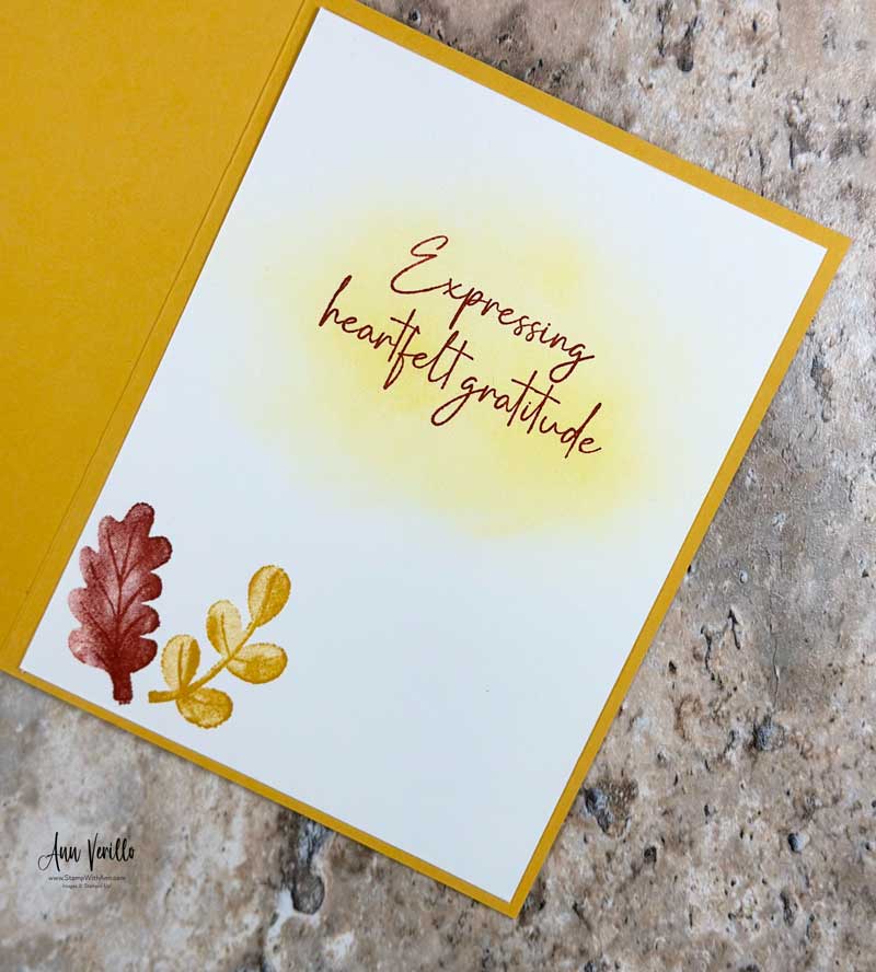 For the inside I added a little more color. First I added some Crushed Curry to the center of the panel with a Blending Brush. Then I stamped the sentiment with Cajun Craze Ink. I also stamped a few leaves with Cajun Craze and Crushed Curry Ink to finish the card!