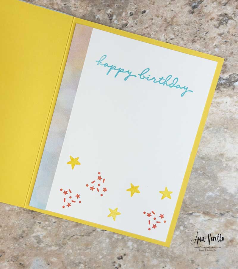 For the inside I stamped the sentiment in Balmy Blue Ink. Then I stamped the stars in Daffodil Delight and the confetti in Calypso Coral Ink.