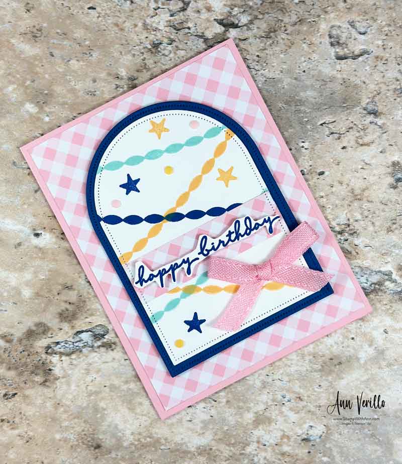 The focal point was created using the Everyday Arches Dies. Streamers and stars were stamped across the arched panel in coordinating ink colors. The sentiment “happy birthday” was stamped and fussy cut and adhered to a pattern of the Wildflower Birthday DSP with Stampin’ Dimensionals.