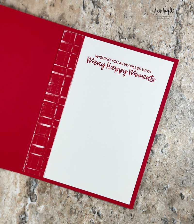 For the inside I added a strip of the embossed panel using same technique. Then I stamped the sentiment in Real Red Ink!