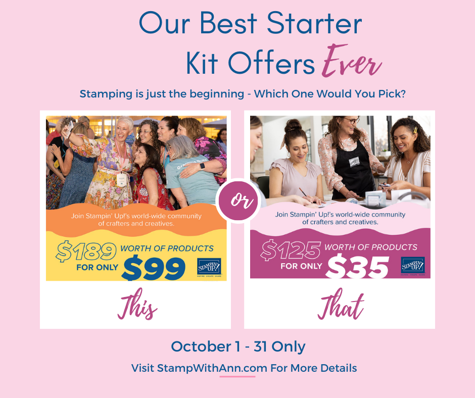Do you want some awesome product to begin your crafting experience OR add to your current collection …. this is the deal for you! Starting Today – October 1st through 31st, Stampin’ Up! is offering their very best Starter Kit deal EVER. Click HERE to join my team and let your crafting adventure begin!