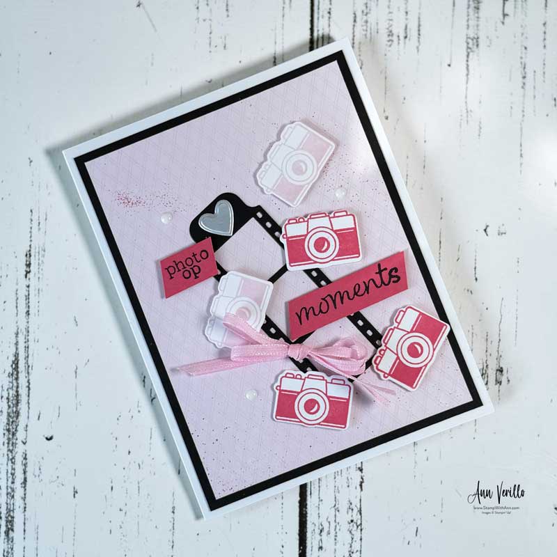 The cameras from the Capturing Smiles Bundle were stamped in Strawberry Slush and Bubble Bath, then die cut with the coordinating dies. I also die cut Basic Black cardstock using the film strip die, which creates a fun focal element and ties perfectly into the photo theme.