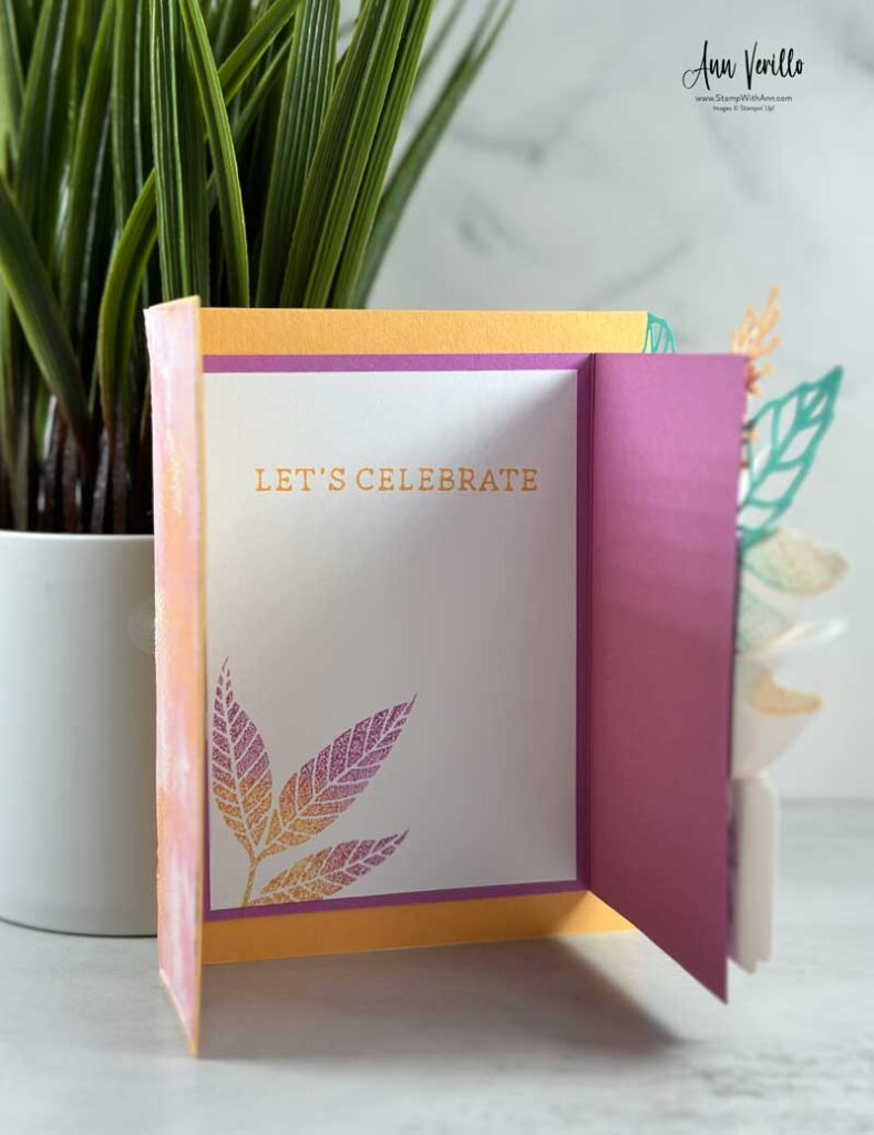 For the inside I stamped the sentiment from the Simply Said Stamp Set in Peach Pie Ink. And I stamped the leaf the same way I did the ones for the front.