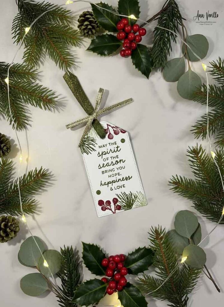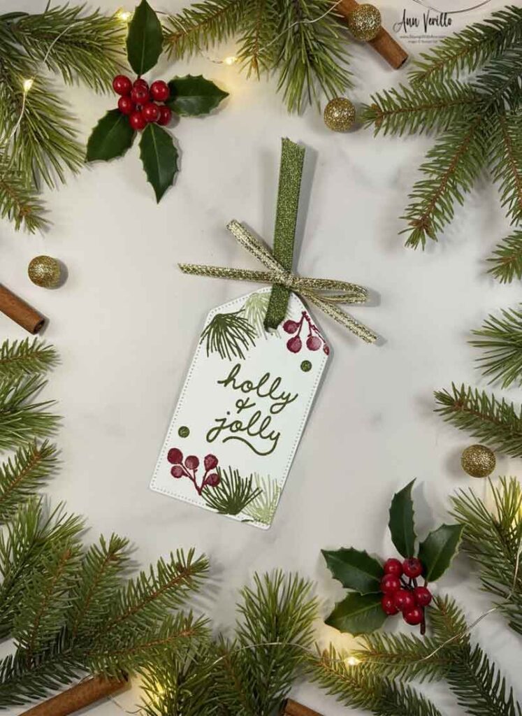 For the first tag I stamped pines and berries first. Then I stamped the sentiment from the Jolly Holly Stamp Set in Mossy Meadow Ink.