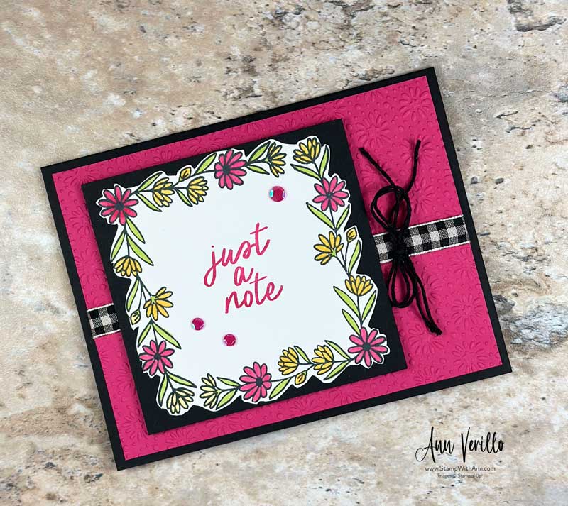 Happy February Stampers & Crafters! I’m excited to share the first card in my weekly Card Class Kit To Go featuring the Corner In Bloom Stamp Set. I created this bright and cheery Corner In Bloom Note Card today – I love the colors against the black background! This stamp set is an absolute must-have, and the best part? You can get it FREE during Sale-a-bration with a $60 order in my online store!