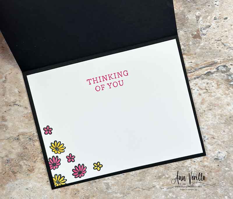 For the inside I stamped a few of the flowers in Tuxedo Black Ink and colored them with the Stampin’ Blends. I stamped the sentiment form the Simply Said Stamp Set in Melon Mambo to finish off the inside!