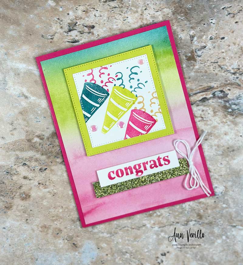 The background is created using the Full of Life DSP, which gives the card a beautifully blended look. The focal point features celebratory party blowers, stamped on the Basic White Stylish Shapes Die and layered over a larger Lemon Lime Twist Stylish Shapes Die. A strip of Old Olive Glimmer Paper adds just the right amount of shimmer beneath the bold Congrats sentiment stamped in Melon Mambo Ink.