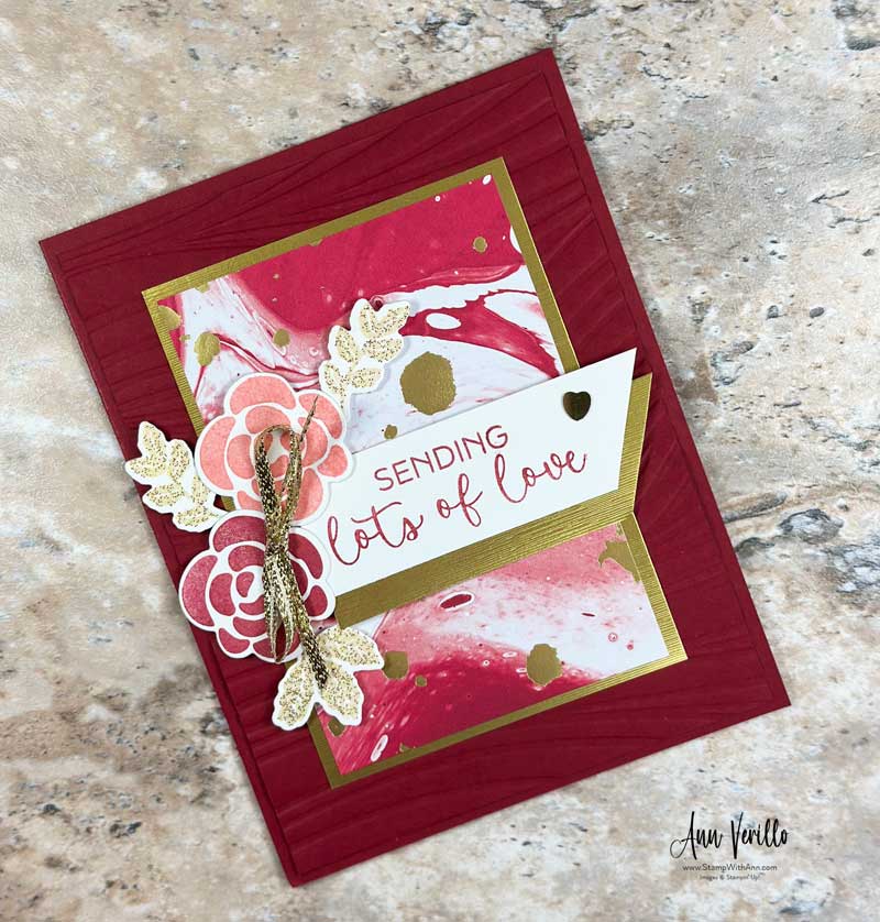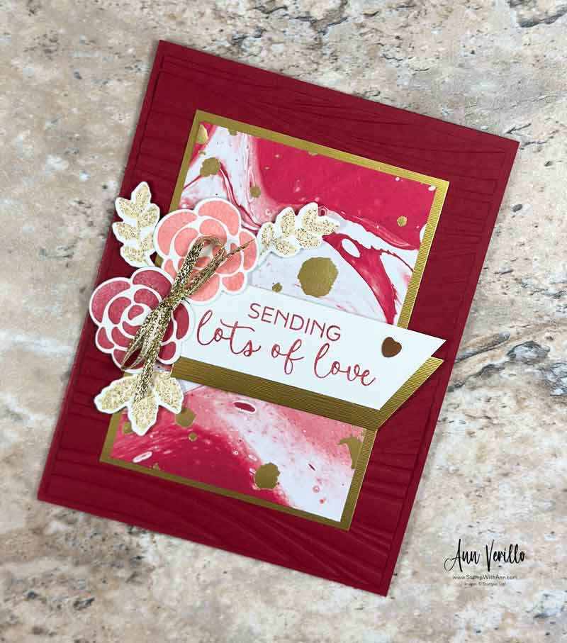 My card starts with Cherry Cobbler card stock. I embossed a panel of Cherry Cobbler card stock with the Soft Waves 3D Embossing Folder and adhered it to the card base. Next I matted a panel of the Marbled Elegance Designer Series Paper to a panel of Brushed Gold Foil and adhered it to the front with Multipurpose Liquid Glue.