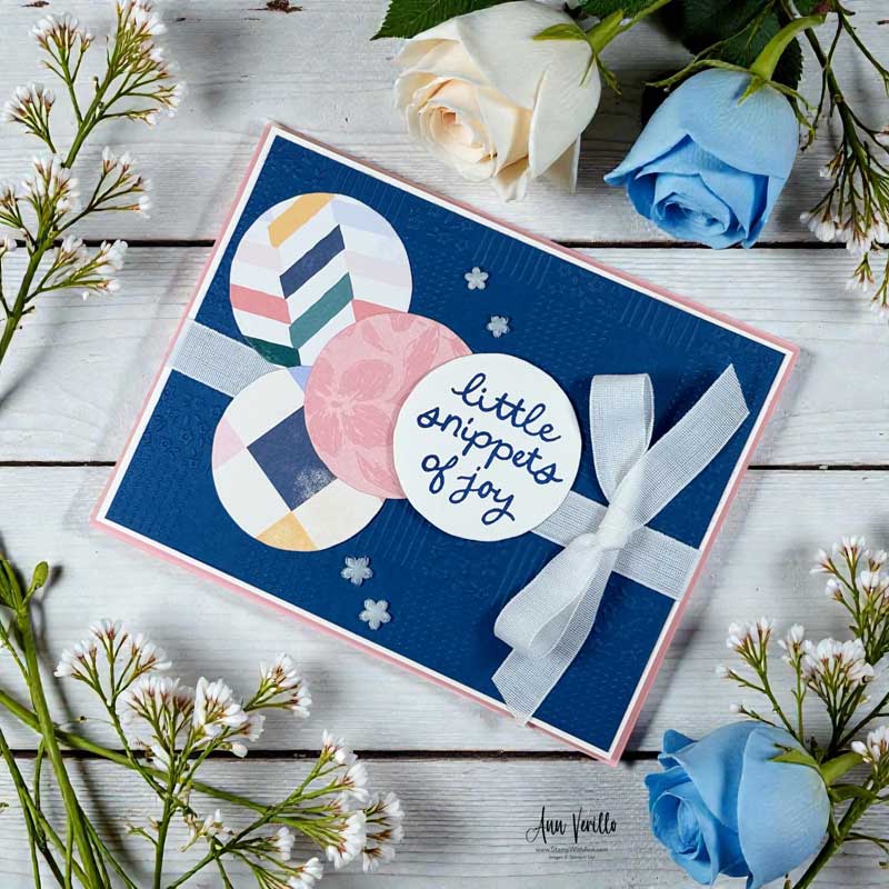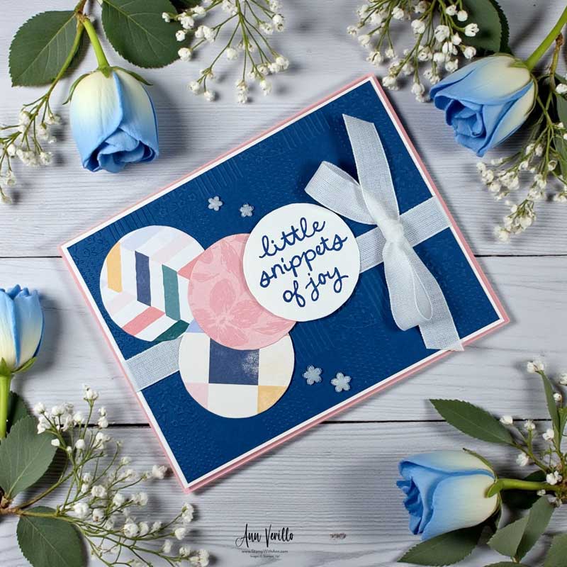 Next came the fun part! I die cut three different patterns from the Square Snippets Designer Series Paper using the circle die from the Joyful Squares Dies. These patterned circles add movement and interest while keeping the layout balanced.