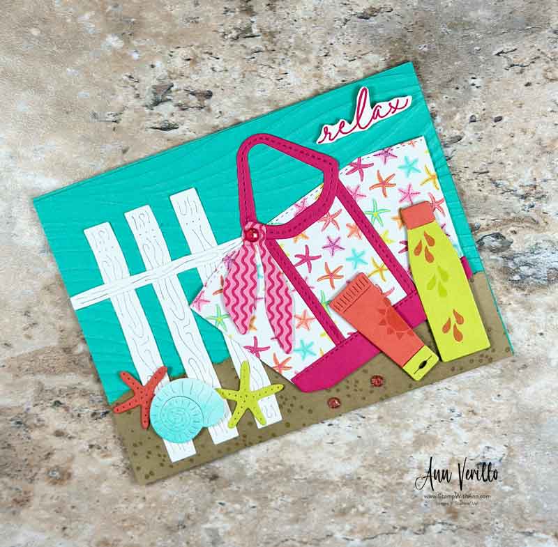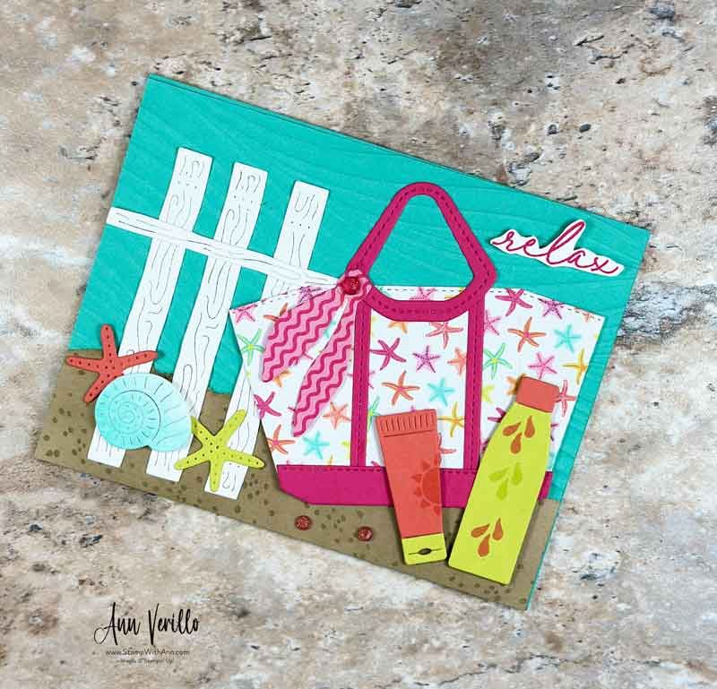 I die cut the tote out with the Ocean Friends Designer Series Paper. Then I die cut the tote handles/base with Melon Mambo card stock. The other beachy accessories were die cut with Lemon Lime Twist, and Calypso Coral card stock. And of course the fence was die cut with Basic White card stock.