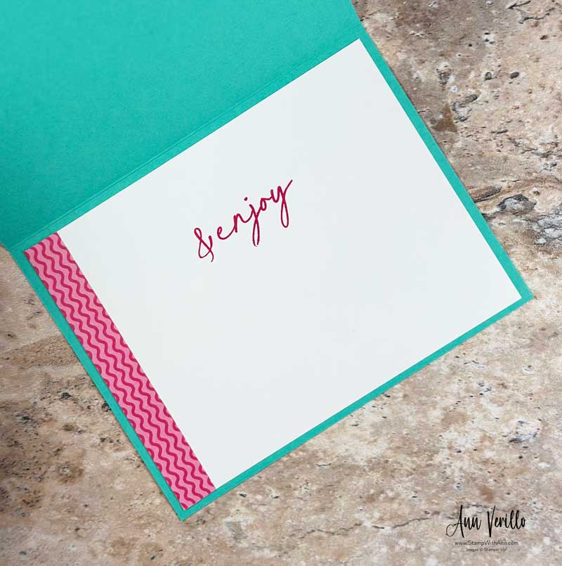 For the inside I added an strip of the Ocean Friends DSP and stamped the sentiment in Melon Mambo Ink.