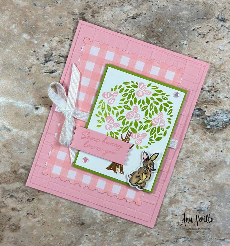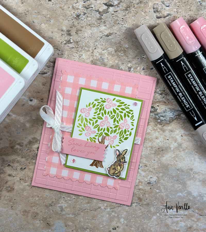 Next I stamped the tree images in Granny Apple Green, Pecan Pie and Pretty In Pink Inks. Then I adhered the stamped image to a panel of Granny Apple Green card stock and adhered it to the card base with Stampin’ Dimensionals. I stamped the bunny from the Storybook Friends stamp set and colored him in with Crumb Cake and Petal. Pink Stampin’ Blends. Then I die cut the bunny with the corresponding Storybook Friends Die and adhered to the front with Stampin’ Dimensionals.