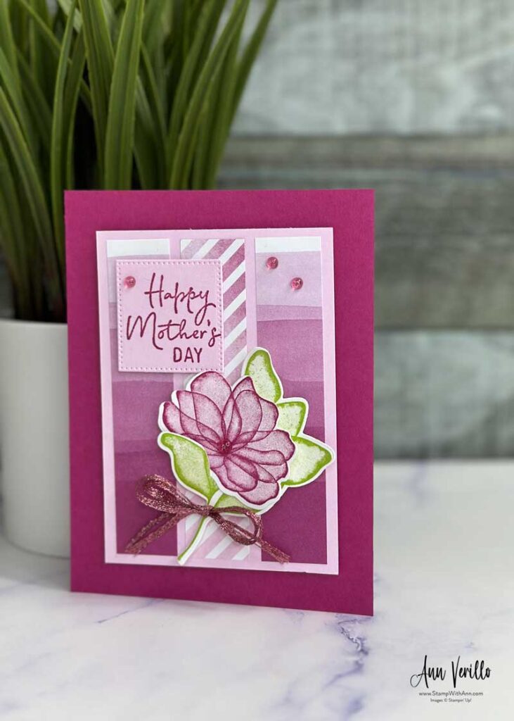 My card starts with Berry Burst card stock. I matted Bright and Beautiful Designer Series Paper to a panel of Bubble Bath card stock.